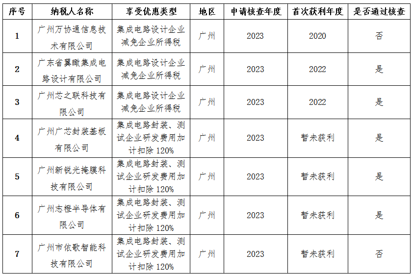 根据《广东省工业和信息化厅关于核查2024年广州市申报享受集成电路产业企业所得税、研发费用加计扣除比例优惠政策企业名单的通知》的要求和工作部署,我局对企业提交的2024年广州市申报享受集成电路产业企业所得税、研发费用加计扣除比例优惠政策的备案资料是否符合政策条件组织专家开展了核查工作,现将核查结果予以公示,公示期5个工作日。