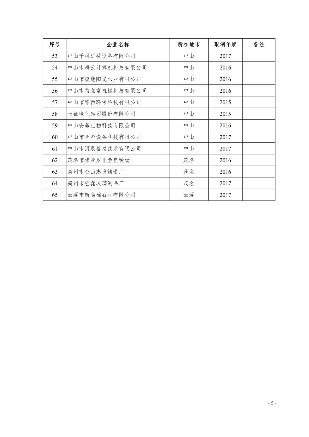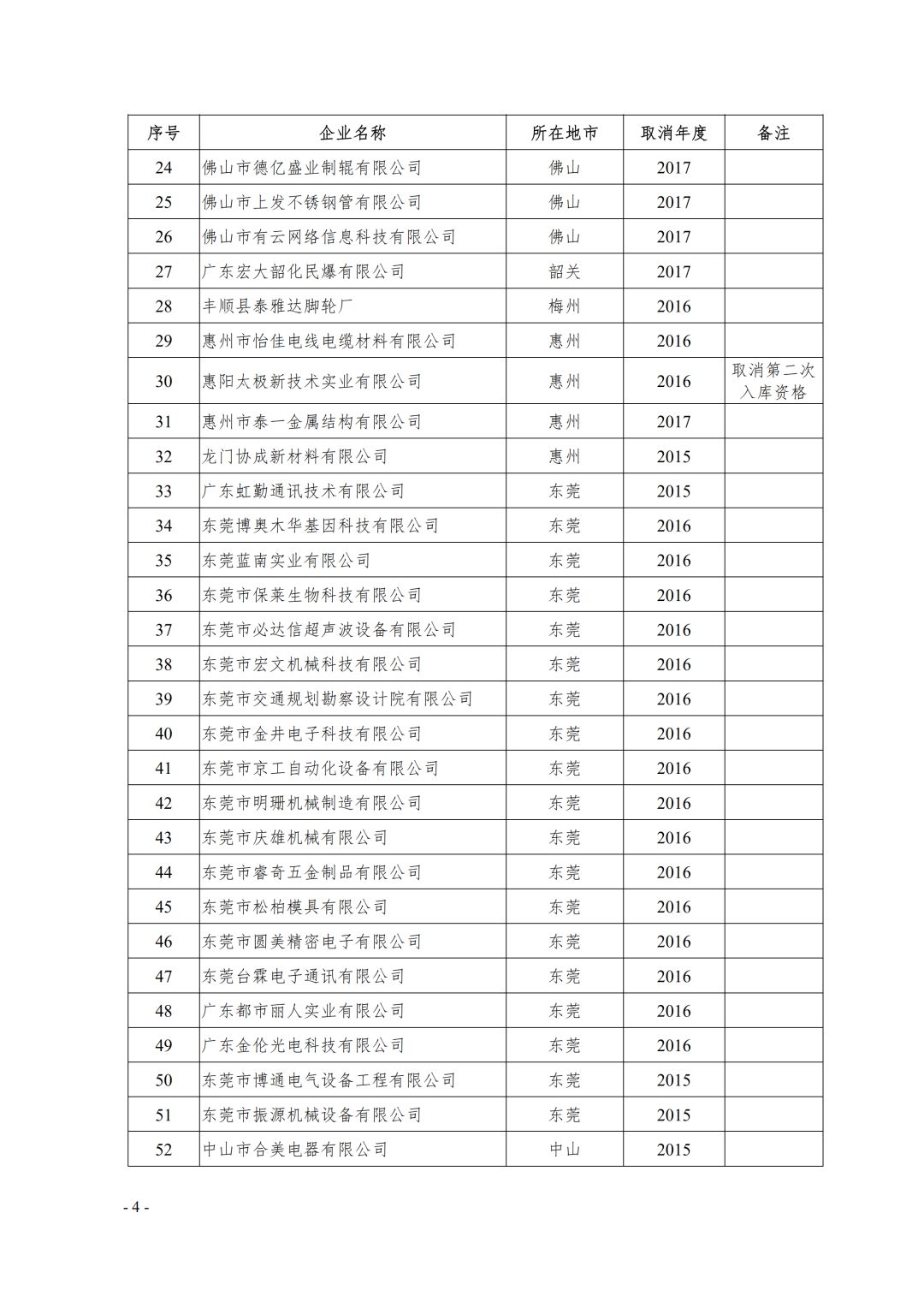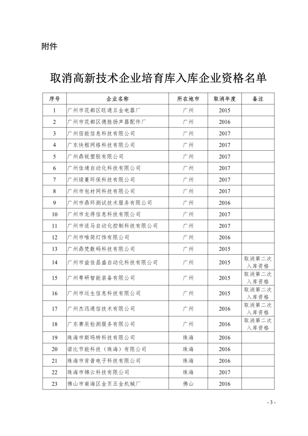 根据《广东省2015至2017年度创新型企业培育政策落实及相关财政补助资金使用绩效专项审计调查报告》(粤审教专报〔2019〕3号)反馈意见,省科技厅在地市科技部门核查基础上,对相关高新技术企业培育库入库企业的申报、评审、入库、奖补等情况进行复核,经核实广州市花都区旺通五金电器厂等59家企业不符合高新技术企业培育库入库要求、广州市益佳昌盛自动化科技有限公司等6家企业重复入库。根据《广东省高新技术企业培育工作实施细则》(粤科函高字〔2016〕1737号)有关规定,研究决定取消广州市花都区旺通五金电器厂等59家企业的高新技术企业培育库入库企业资格,取消广州市益佳昌盛自动化科技有限公司等6家企业的高新技术企业培育库第二次入库资格,相关财政资金收回按有关规定办理。