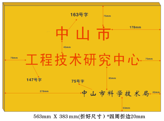 根据《中山市工程技术研究中心认定管理办法》(中山科发〔2023〕96号)的有关精神,为进一步规范市级工程技术研究中心管理和工程技术研究中心牌匾制作工作,市级工程技术研究中心牌匾由依托单位按照规格自行安排制作,制作规格统一要求如下: